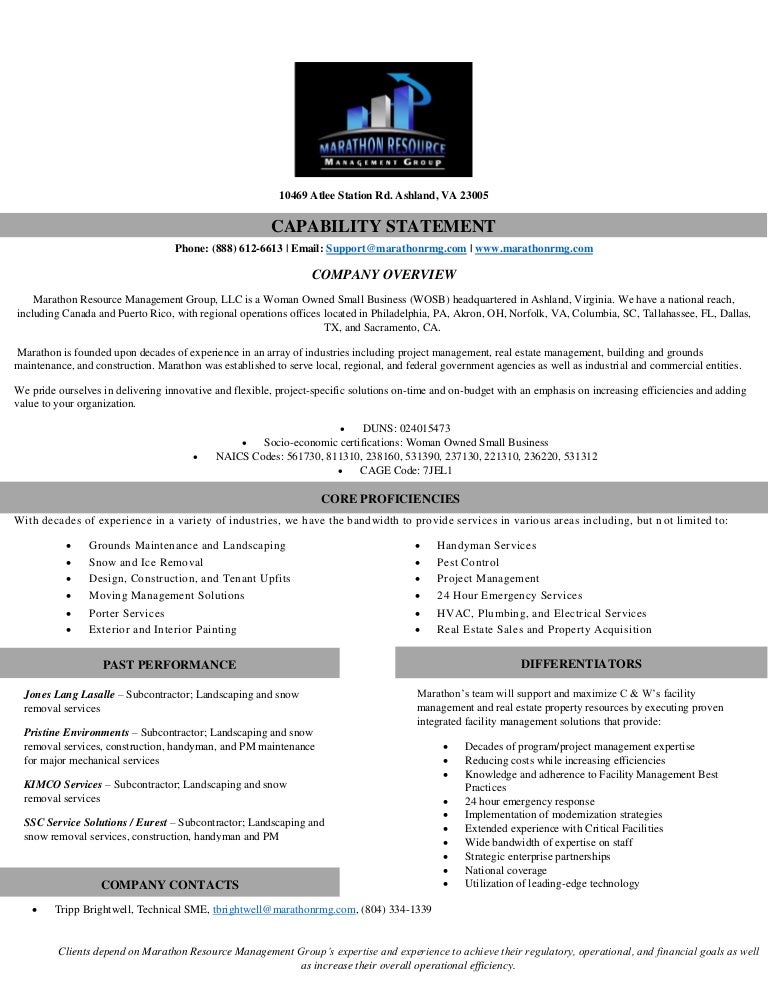 About Us Marathon Resource Management Group LLC is a Woman Owned Small Business WOSB headquartered in Ashland Virginia. Marathon Resource Management Group is a full-service construction facility maintenance and asset management company headquartered in Virginia. Marathon hires subcontractors around the country to perform work on commercial properties for clients from painting to cleaning to landscaping to construction and handyman jobs.