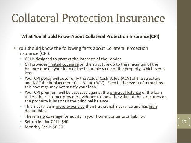What Is Collateral Protection Insurance. A Complex Definition Made Simple When taking out an auto loan borrowers agree to maintain physical damage insurance on the vehicle naming the financial institution as an additional interest on the policy. If you dont maintain a current insurance policy your lender will pursue collateral protection insurance for your car.