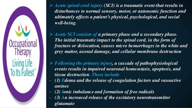 Spinal cord injury occupational therapy. Acute SCI consists of a primary phase and a secondary phase. Occupational Therapy and the Care of Individuals With Spinal Cord Injury. Key Points Occupational therapy will help prepare SCI patients to return to their everyday lives through restorative and compensatory strategies.
