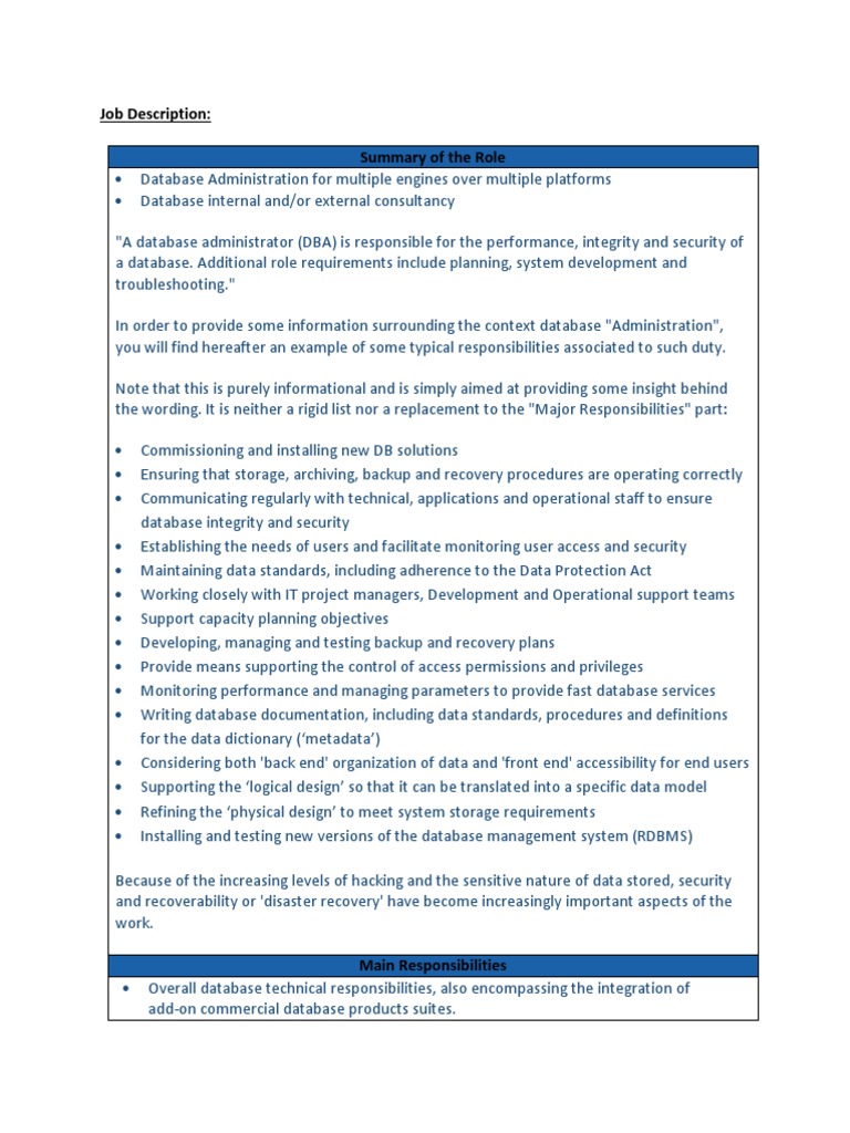 This Database Administrator DBA job description template is optimized for posting on online job boards or careers pages and is easy to customize for your company. They create data storage and retrieval systems troubleshoot database issues and implement database recovery procedures and safety protocols. Click on a job to view the job description for that group.