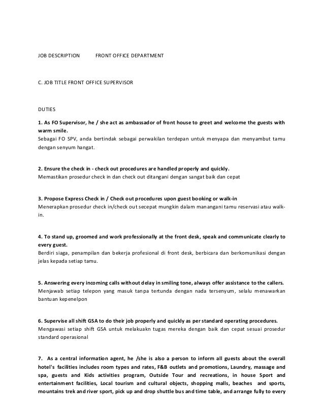Job Description Front Office Supervisor Hotel Technology Engineering